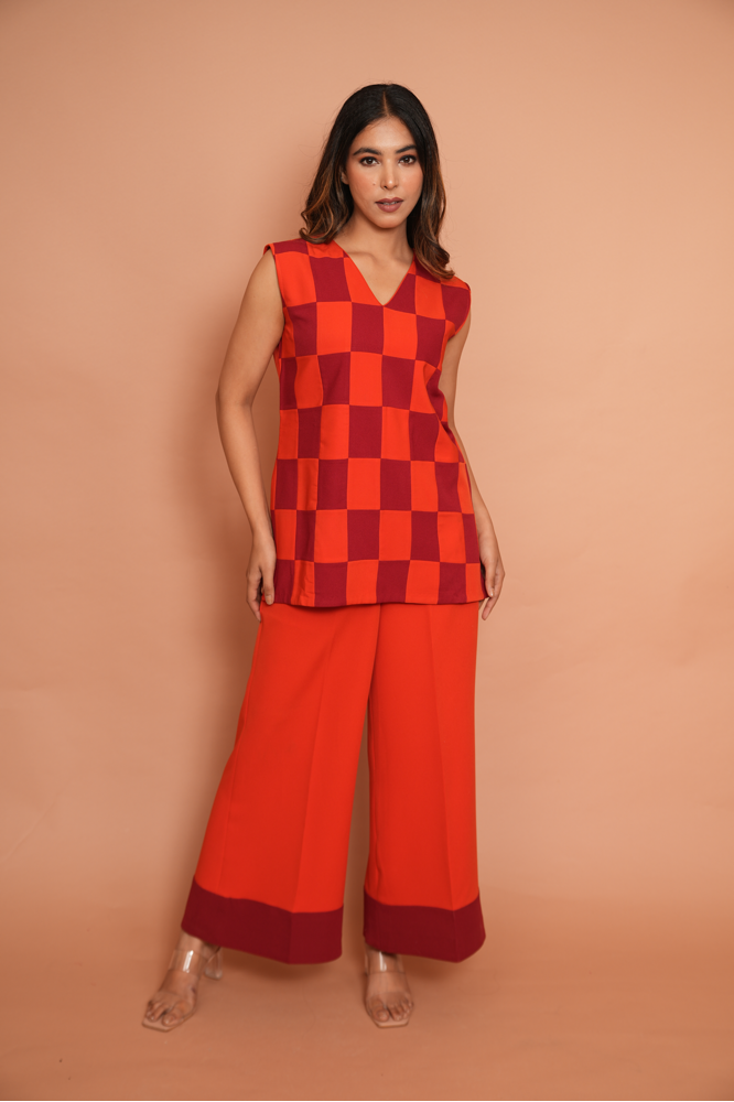 This bold red co-ord set features a statements checkerboard  print sleeveless top paired with wide legged pants finished with deep maroon borders, offering a graphic, contemporary edge.